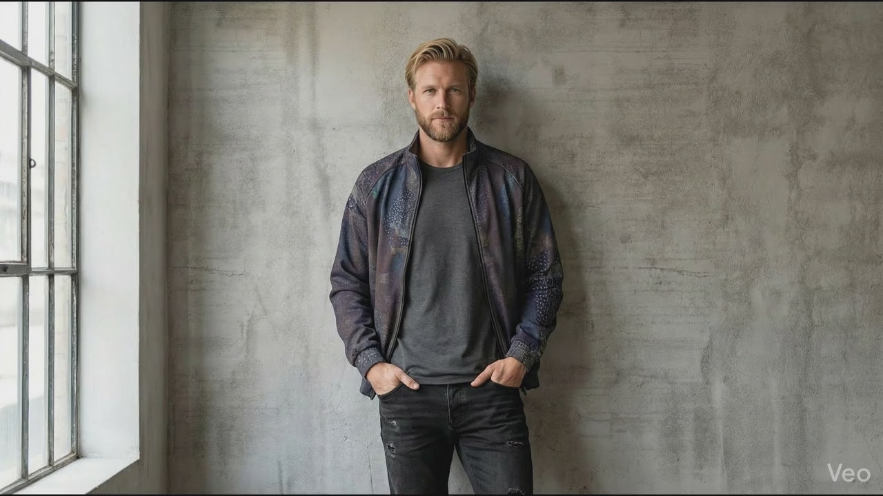 Elevate your streetwear collection with this striking jacket featuring an eclectic patchwork-inspired design in deep purple and indigo hues. The garment showcases a mix of geometric textures and subtle tonal shifts, creating a visually rich, multidimensional aesthetic. With its classic stand collar and streamlined zip-front, this jacket seamlessly blends artistic expression with contemporary urban functionality.