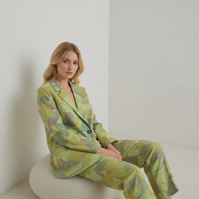 The Geomosaic Women's Leisure Blazer is a refined statement piece featuring a soft geometric pattern in shades of lime green, sage, muted lavender, and pastel yellow. Designed with clean lapels, a relaxed tailored fit, and a single-button closure, this blazer blends artistic texture with modern sophistication. The classic version of the suit is made of pure natural fiber fabric, it is comfortable. Button closure and side pockets allow for proper storage.