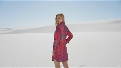 The Dark Pink Shirt Dress captures the feel of painted light layered over fabric. A dense field of fine, multicolored marks creates a shimmering surface—like pigment scattered across a glowing red ground. The effect is rich and tactile, with depth that shifts subtly as the dress moves.